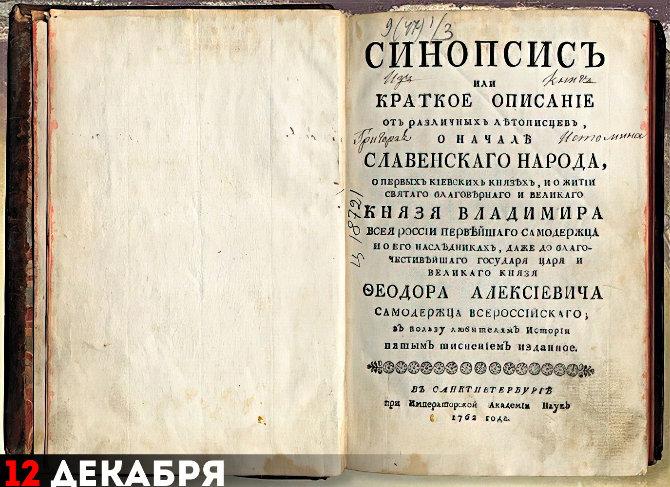 12 декабря 1674 года в Киево-Печерской типографии был издан «Синопсис» – первый краткий очерк русской истории. Большинство историков сходятся во мнении, что его автором был архимандрит Киево-Печерской лавры Иннокентий Гизель. Книга переиздавалась около 30 раз, последний раз в 1861 году, переводилась на греческий, латинский и румынский языки. В XVIII веке «Синопсис» был самым распространённым историческим сочинением в России. Традиционно считается одной из важных вех в формировании концепции общерусского единства Нового времени. До середины XIX века «Синопсис» использовался в учебных заведениях как учебник по истории. Вместе с тем, к концу XVIII века, когда в народных училищах была введена дисциплина «Российская история», в качестве учебника русской истории был и «Краткий российский летописец» Михаила Ломоносова, впервые изданный в Петербурге в 1760 году.