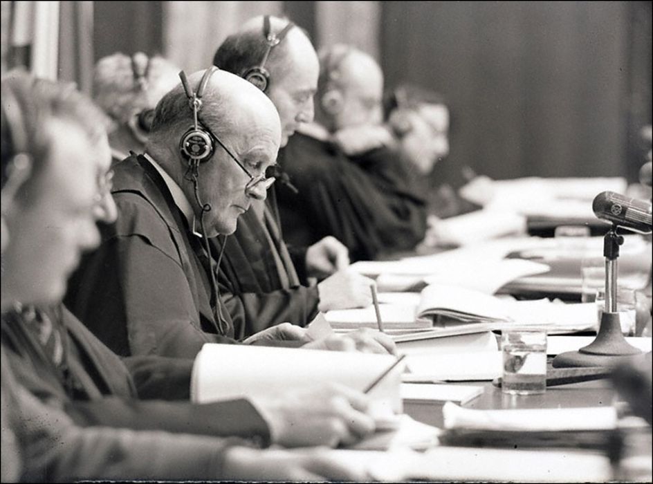 Председатель Международного военного трибунала во Дворце юстиции на Нюрнбергском процессе лорд юстиции Джеффри Лоренс (Великобритания).
