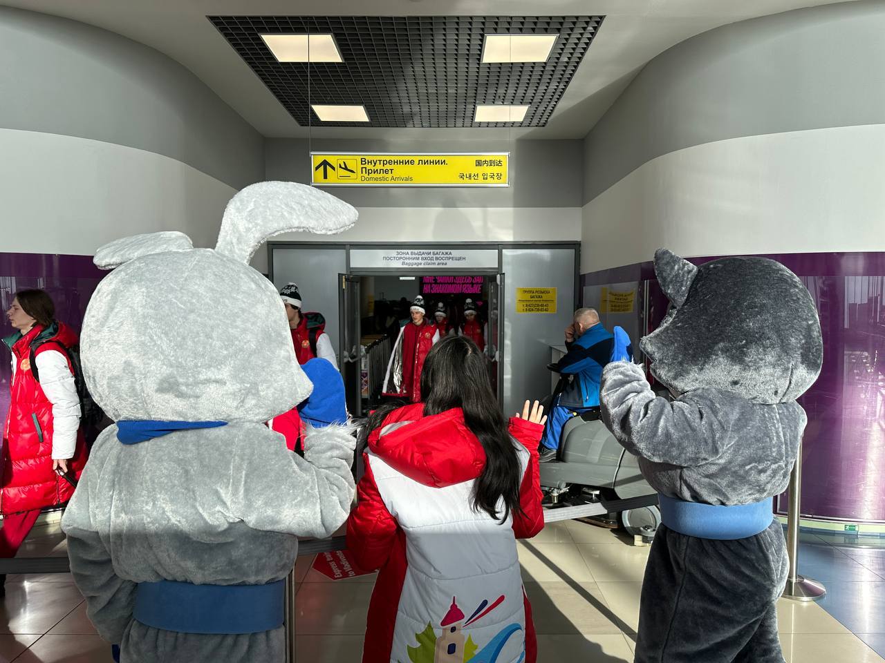 Юных спортсменов встретили волонтёры и талисманы Игр «Дети Приморья» – зайка Уся и волчонок Ханни.