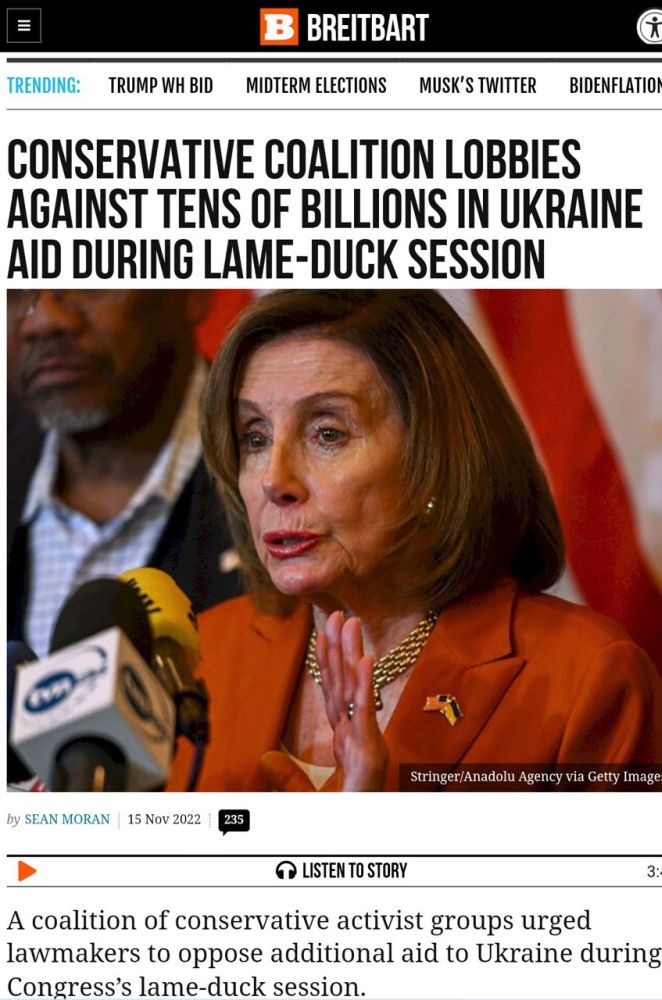 «Мощная коалиция консервативных групп Соединённых Штатов призвала законодателей выступить против дополнительной помощи Украине во время заседания конгресса до окончания его следующей сессии. Активисты консервативных групп написали лидеру республиканцев в палате представителей Кевину Маккарти, наиболее вероятному следующему спикеру палаты, и нынешнему спикеру Нэнси Пелоси письмо, в котором призвали законодателей не спешить с ещё одним крупным пакетом помощи для Украины во время следующей сессии конгресса. Эта сессия совпадает с остаточным сроком президентства Байдена, который в США называют временем хромой утки»,