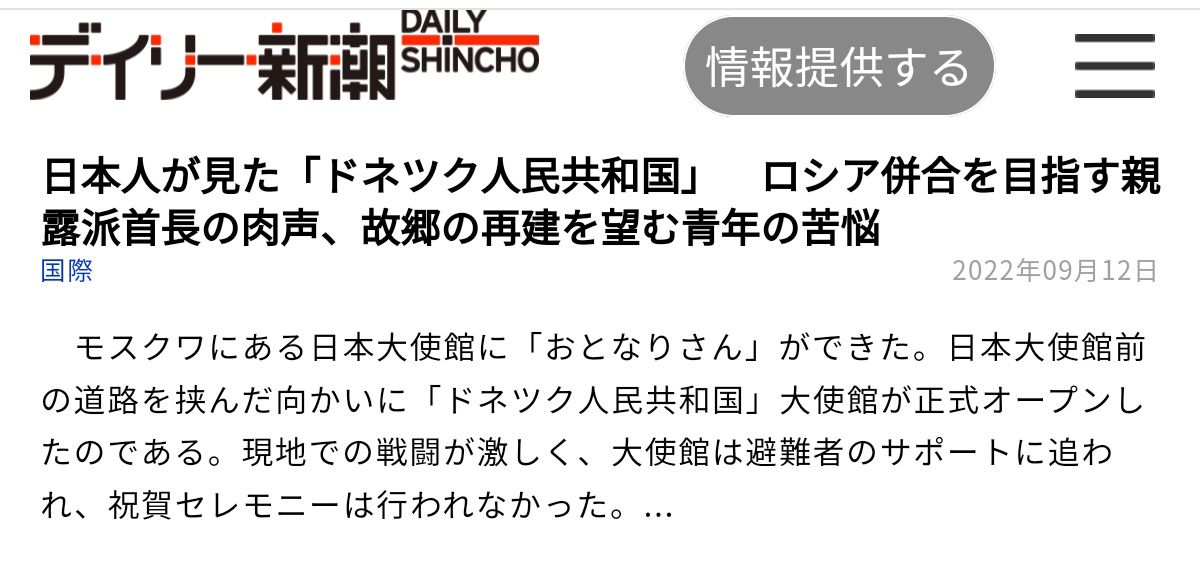 «Прошло полгода с начала СВО России на Украине. Я вижу в японских СМИ большое количество материалов по этому вопросу, однако все они сильно отличаются от того, что видишь своими глазами. Когда я писала эту статью, в небольшой деревне на Севере ДНР под артиллерийским обстрелом погибло 13 спасателей. Под украинским артиллерийским обстрелом»,