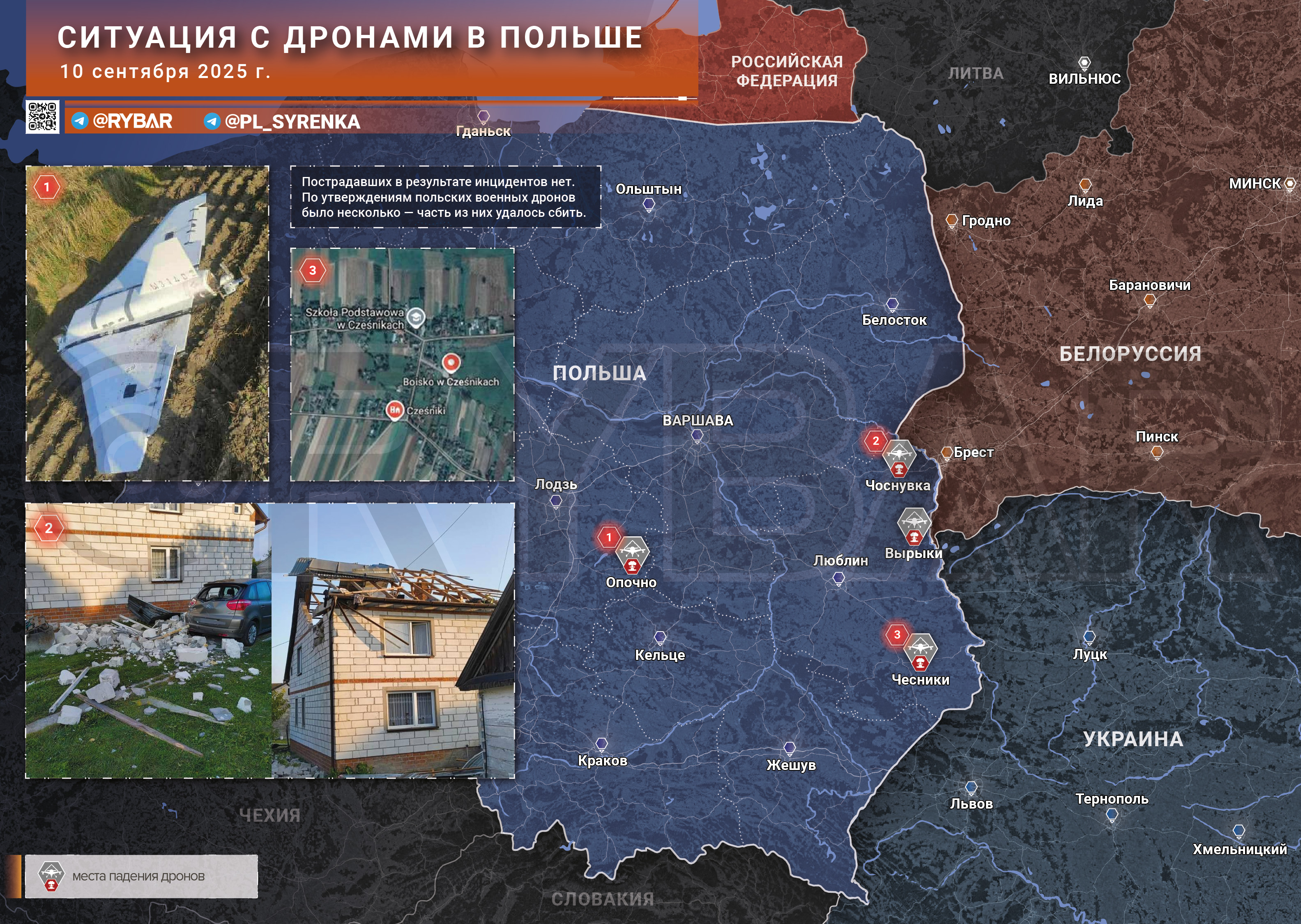Главная новость дня 10 сентября – якобы российские дроны залетели в воздушное пространство Польши, причём смогли проникнуть достаточно далеко вглубь территории страны – на 50 километров, при этом были подняты для перехвата истребители F-16 ВВС Польши, работала польская ПВО, однако перехватить беспилотники не смогли.