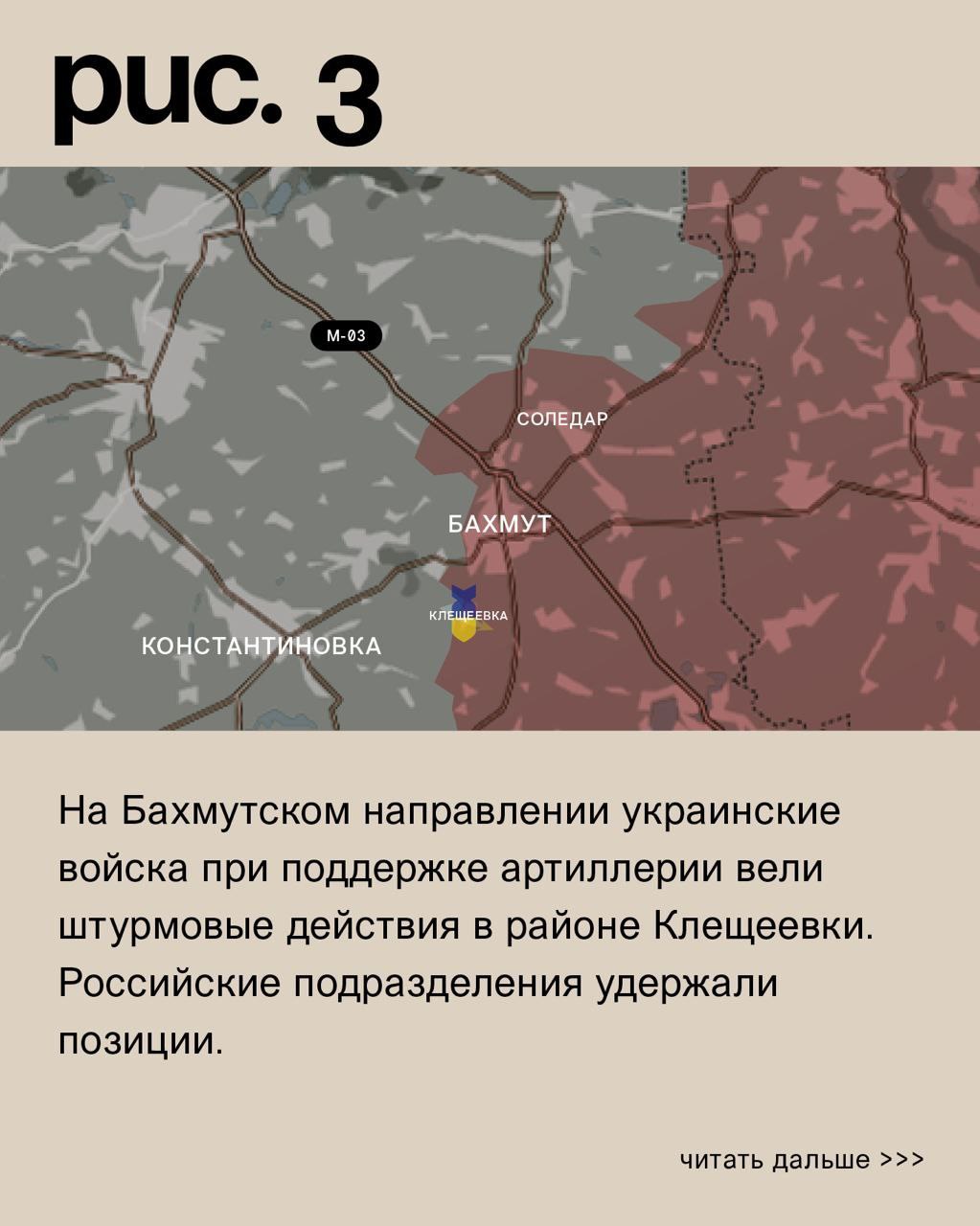 На БАХМУТСКОМ направлении украинские войска при поддержке артиллерии вели штурмовые действия в районе КЛЕЩЕЕВКИ. Российские подразделения удержали позиции.