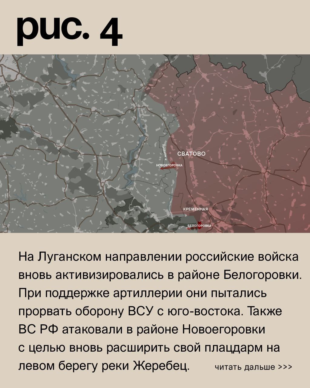 На ЛУГАНСКОМ направлении российские войска вновь активизировались в районе БЕЛОГОРОВКИ. При поддержке артиллерии они пытались прорвать оборону ВСУ с юго-востока. Также ВС России атаковали в районе НОВОЕГОРОВКИ с целью вновь расширить свой плацдарм на левом берегу реки ЖЕРЕБЕЦ. Российская артиллерия работала по украинским подразделениям в Невском, Купянске, Берестовом, Кисловке, Западном, Двуречной и Тополях.