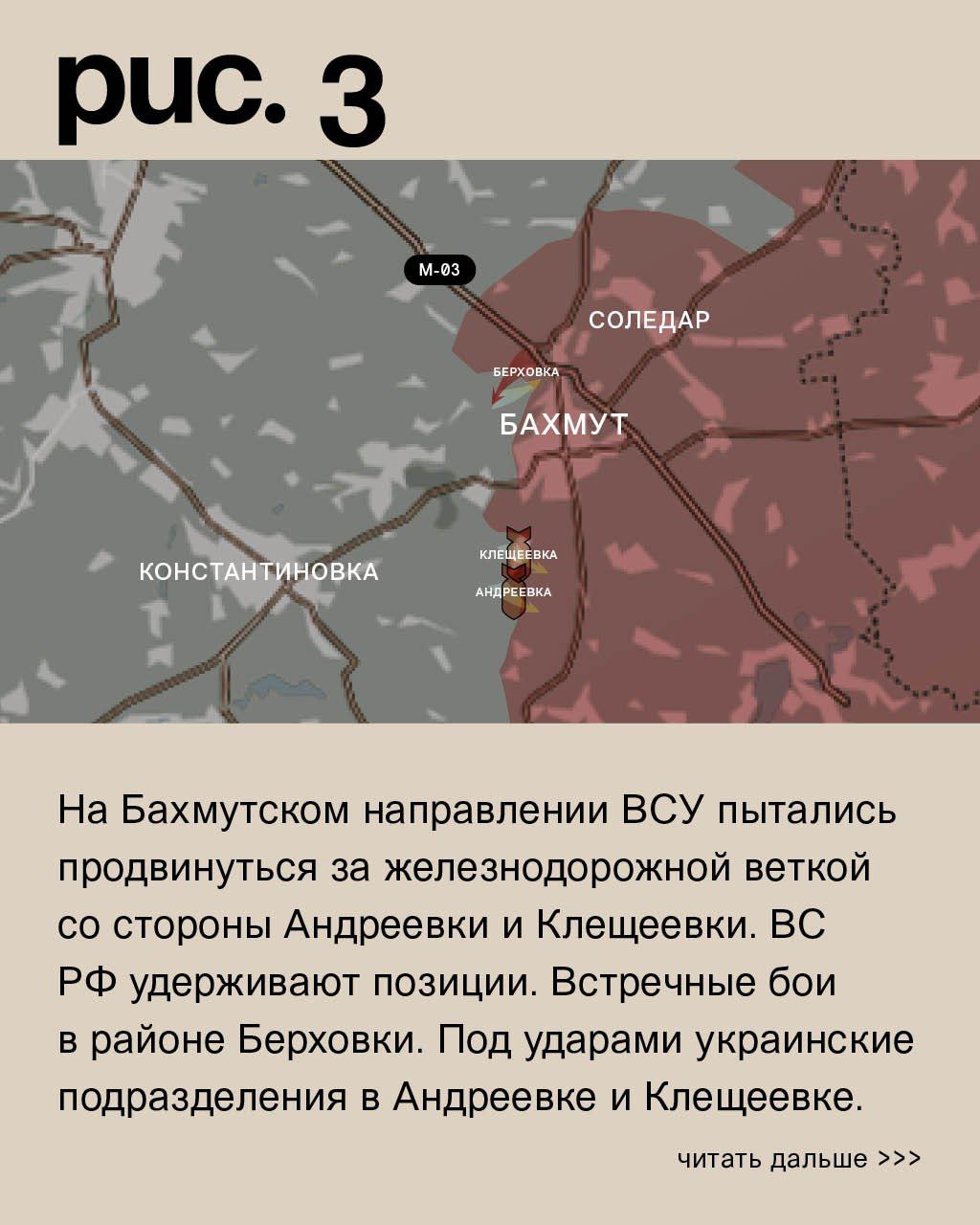 На БАХМУТСКОМ направлении ВСУ пытались продвинуться за железнодорожной веткой со стороны Андреевки и Клещеевки. ВС России удерживают позиции. Встречные бои в районе Берховки. Под ударами украинские подразделения в Андреевке и Клещеевке. Артиллерия ВСУ работала по ВС России в Озаряновке, Курдюмовке, Бахмуте и Ягодном.