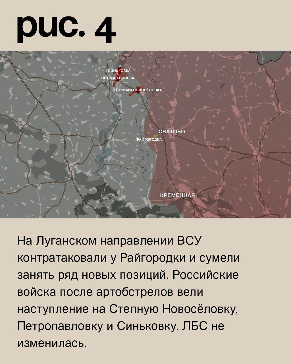На ЛУГАНСКОМ направлении ВСУ контратаковали у Райгородки и сумели занять ряд новых позиций. Российские войска после артобстрелов вели наступление на Степную Новосёловку, Петропавловку и Синьковку. ЛБС не изменилась.