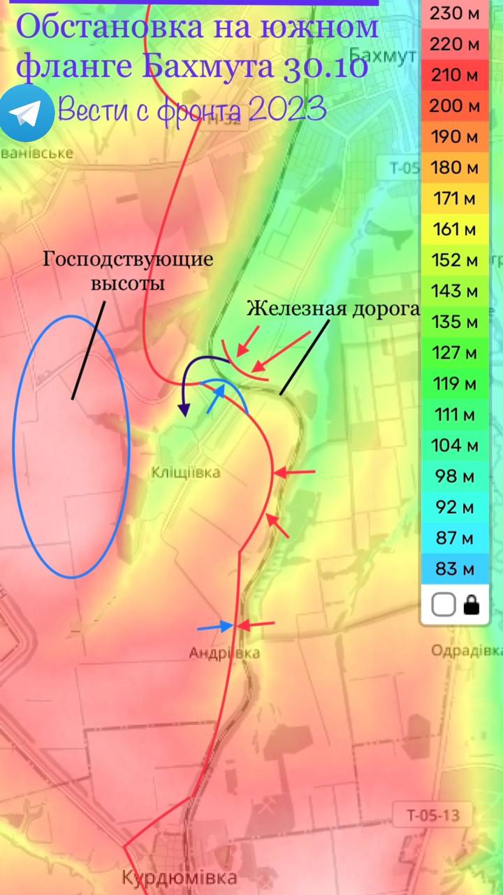 Продолжаются периодические сражения у железнодорожной линии к востоку от АНДРЕЕВКИ и к северу от КЛЕЩЕЕВКИ. У Клещеевки ВСУ недавно удалось прорваться за железную дорогу, после чего они отступили, и расширилась серая зона. У Курдюмовки обстановка стабильная.