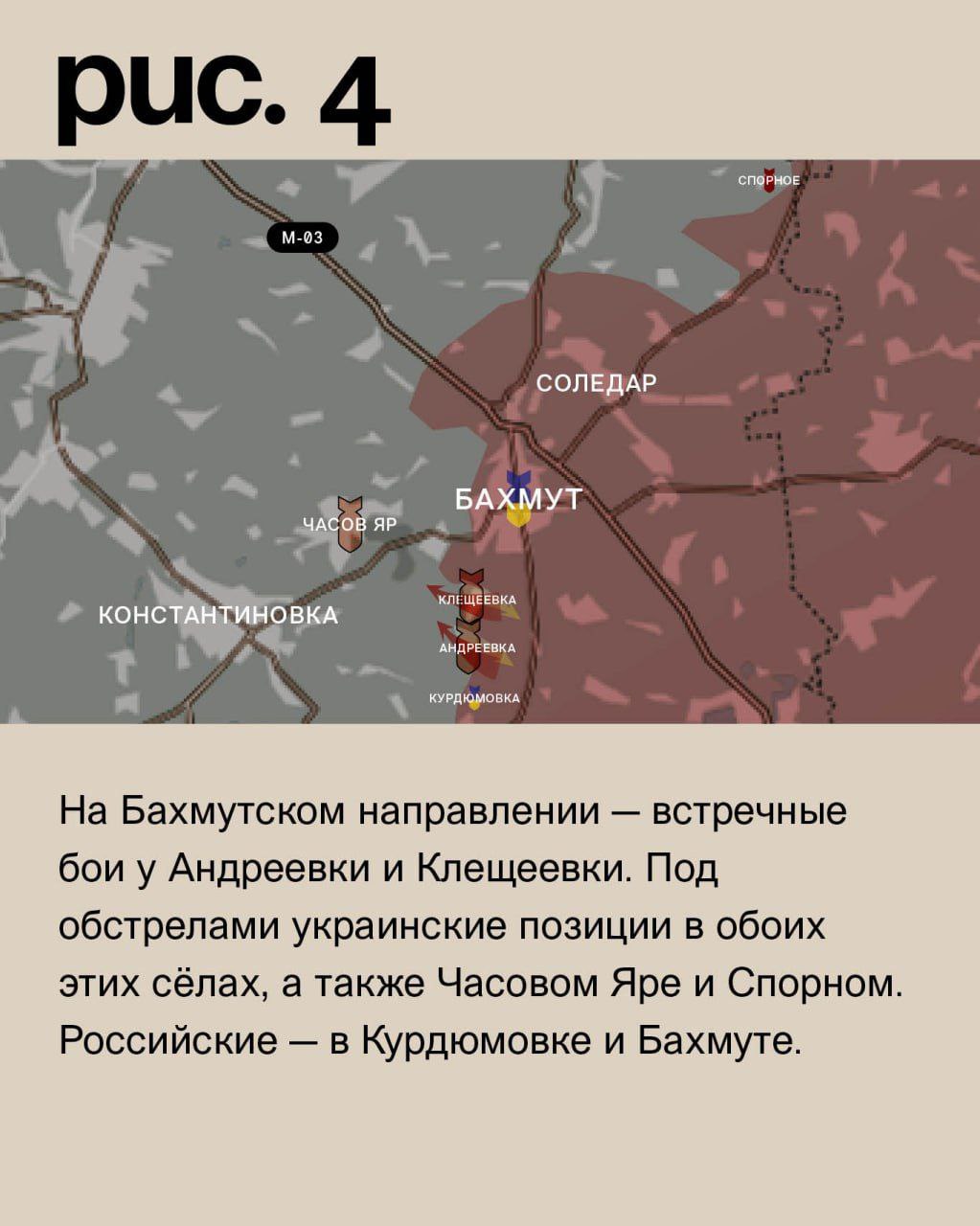 На БАХМУТСКОМ направлении – встречные бои у АНДРЕЕВКИ и КЛЕЩЕЕВКИ. Под обстрелами украинские позиции в обоих этих сёлах, а также Часовом Яре и Спорном. Российские – в Курдюмовке и Бахмуте.