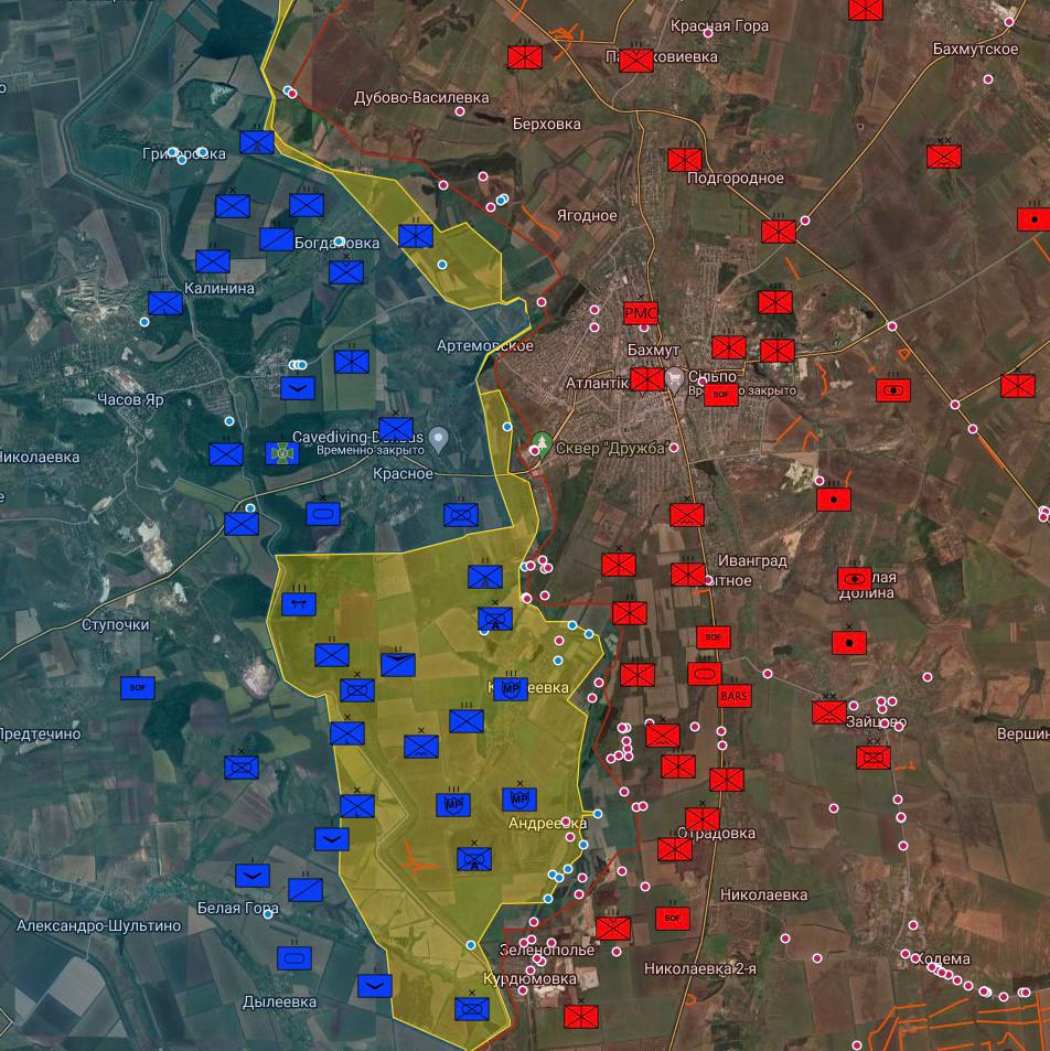 Противник пока занимает господствующие высоты на южном фланге и юго-западнее Артёмовска. Однако ВС России вернули под контроль Берховское водохранилище, что позволяет нам развить инициативу в юго-западном направлении.