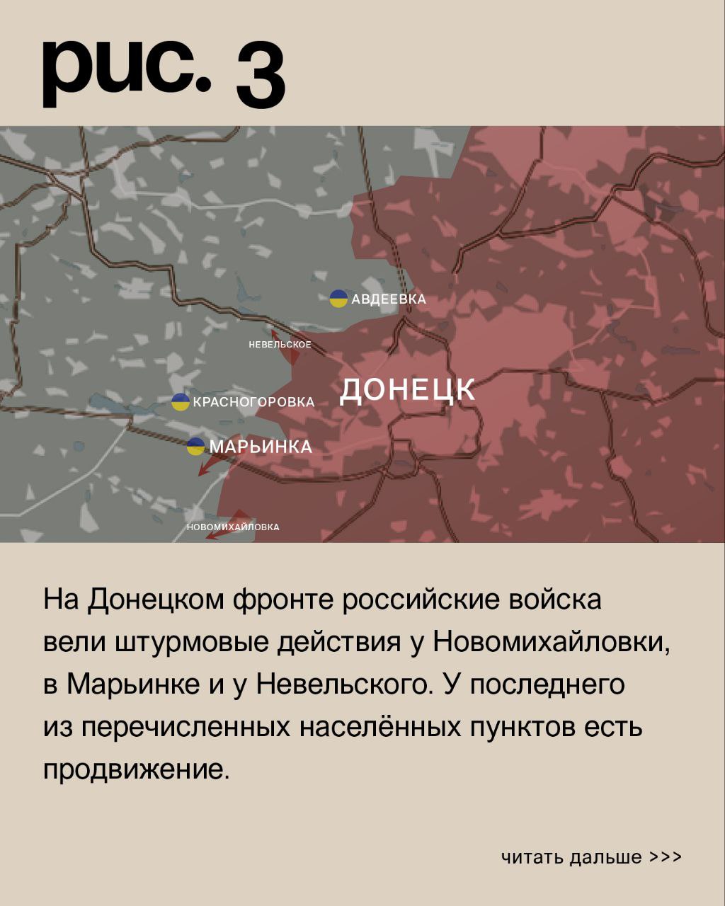 На ДОНЕЦКОМ фронте российские войска вели штурмовые действия у Новомихайловки, в Марьинке и у Невельского. У последнего из перечисленных населённых пунктов есть продвижение. При поддержке артиллерии и авиации они также атаковали в районе Северного (населённый пункт к западу от Авдеевки), на южных подступах к Авдеевке, у Степного (не путать с одноимёнными населёнными пунктами на Запорожском и Угледарском направлениях) и у Новокалинова. У Степного сумели продвинуться в районе террикона и севернее.