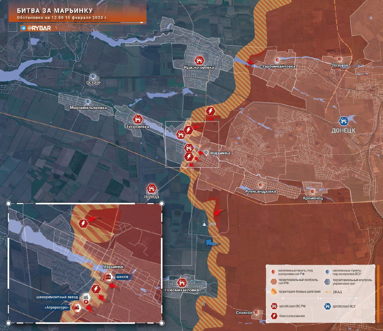 Битва за Марьинку, обзор обстановки по состоянию на 12.00 15 февраля 2023 года от Телеграм-канала «Рыбарь»: