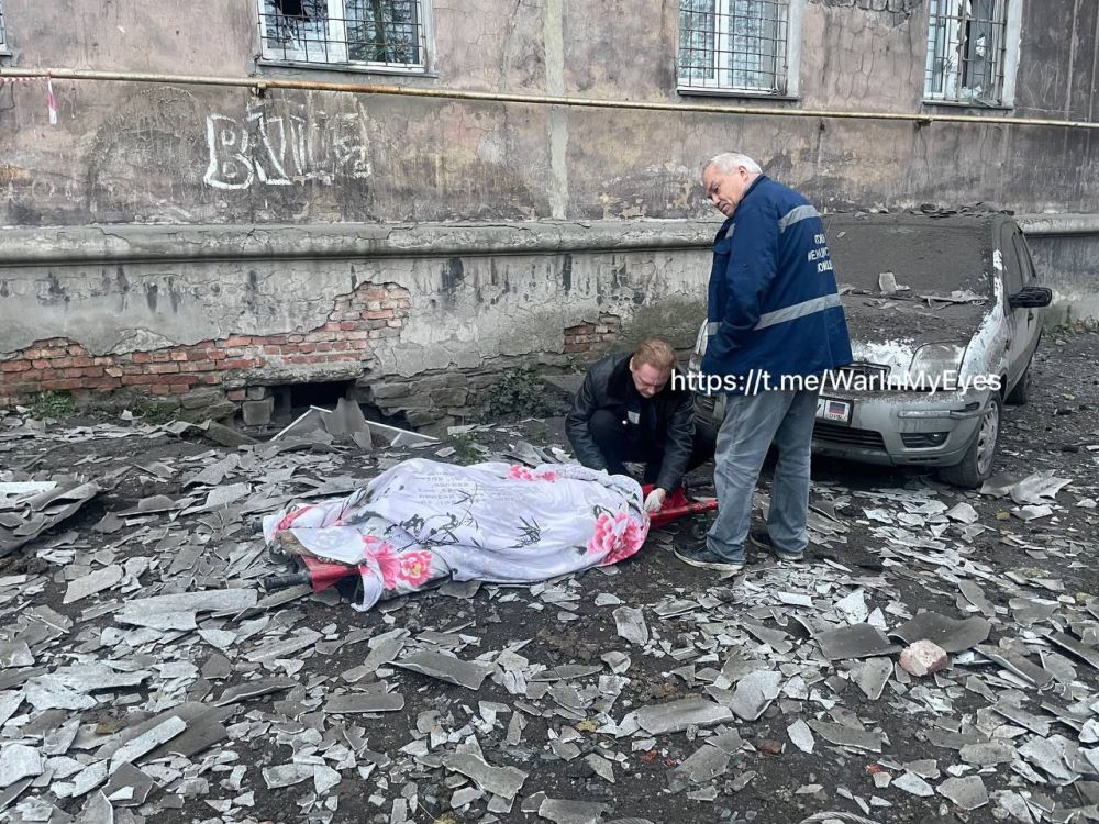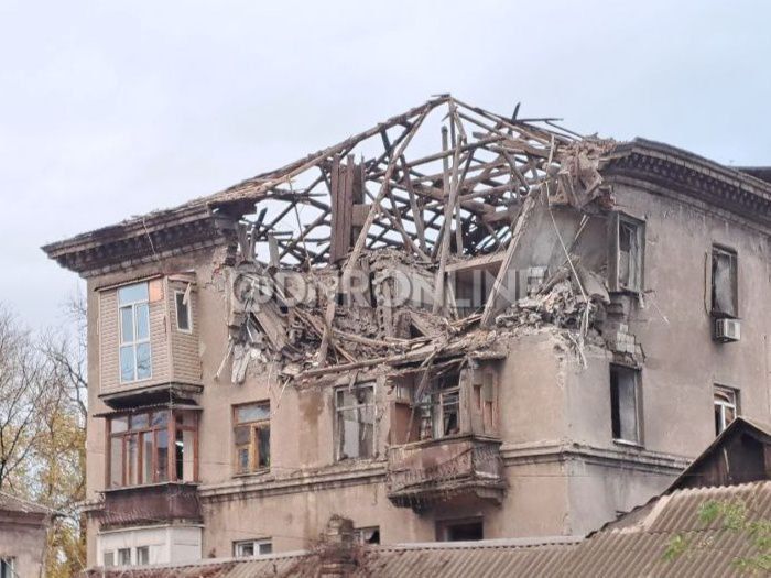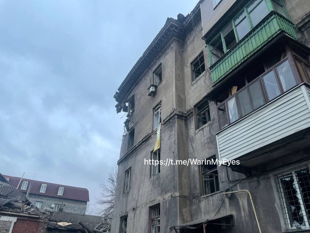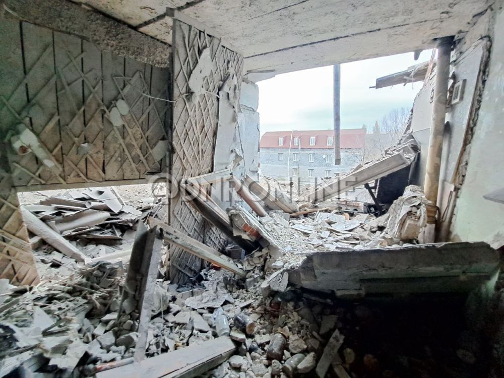 Квартира на верхнем этаже четырёхэтажной сталинки полностью разрушена, зияет дыра вывороченной ударом стены. Перед жильцами остальных квартир этого дома встаёт вопрос поиска жилья.