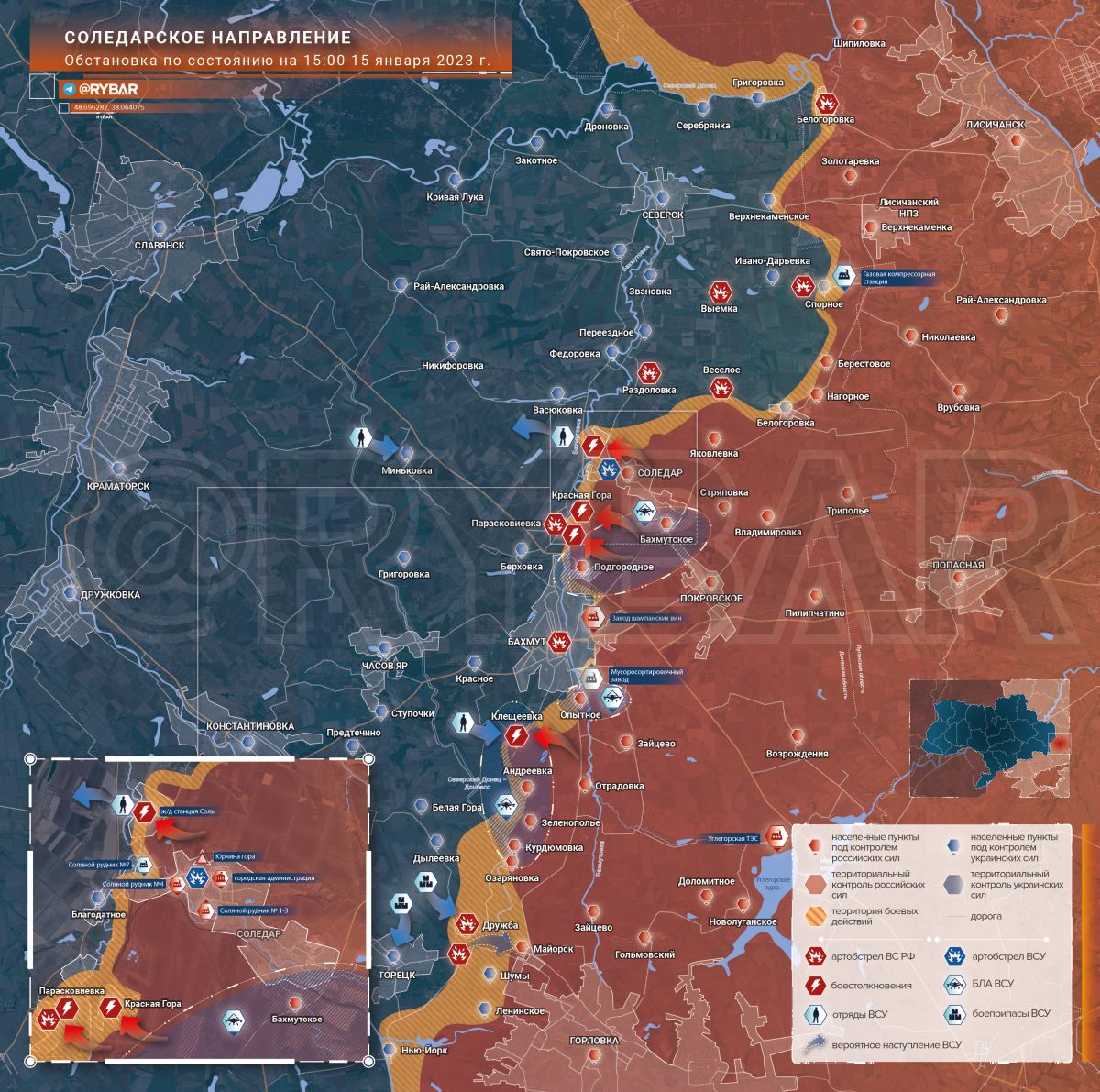 К юго-западу от СОЛЕДАРА продолжается наступление на позиции ВСУ в КРАСНОЙ ГОРЕ с севера, востока и юга. ВС России также продвигаются окрестностях ПАРАСКОВИЕВКИ у реки БАХМУТКА.