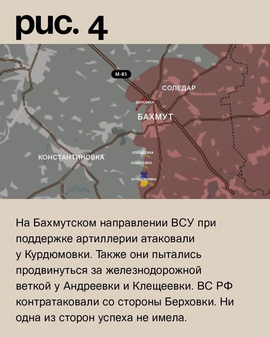 На БАХМУТСКОМ направлении ВСУ при поддержке артиллерии атаковали у Курдюмовки. Также они пытались продвинуться за железнодорожной веткой у Андреевки и Клещеевки. ВС России контратаковали со стороны Берховки. Ни одна из сторон успеха не имела.