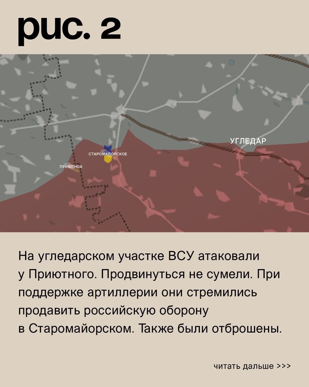 На УГЛЕДАРСКОМ участке ВСУ атаковали у ПРИЮТНОГО. Продвинуться не сумели. При поддержке артиллерии они стремились продавить российскую оборону в СТАРОМАЙОРСКОМ. Также были отброшены.