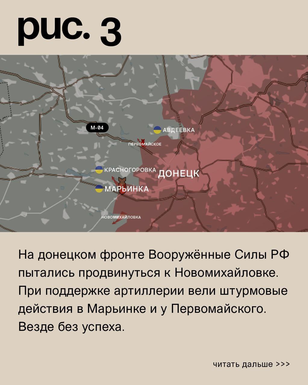 На ДОНЕЦКОМ фронте Вооружённые Силы России пытались продвинуться к НОВОМИХАЙЛОВКЕ. При поддержке артиллерии вели штурмовые действия в МАРЬИНКЕ и у ПЕРВОМАЙСКОГО. Везде без успеха.