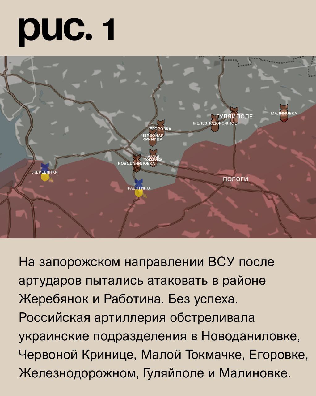 На ЗАПОРОЖСКОМ направлении ВСУ после артударов пытались атаковать село ЖЕРЕБЯНКИ. Без успеха. Такая же участь постигла их штурмовые действия у РАБОТИНО.