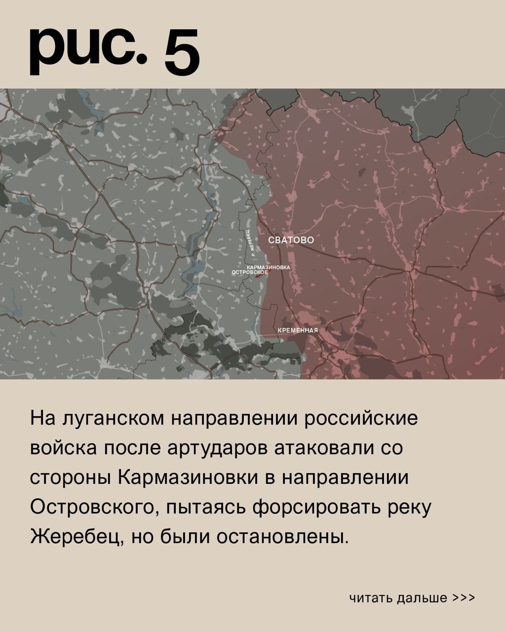 На ЛУГАНСКОМ направлении российские войска после артударов атаковали со стороны КАРМАЗИНОВКИ в направлении ОСТРОВСКОГО, пытаясь форсировать реку ЖЕРЕБЕЦ, но были остановлены.