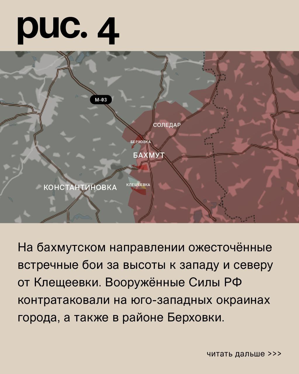 На БАХМУТСКОМ направлении ожесточённые встречные бои за высоты к западу и северу от КЛЕЩЕЕВКИ. Вооружённые Силы России контратаковали на юго-западных окраинах города, а также в районе БЕРХОВКИ.