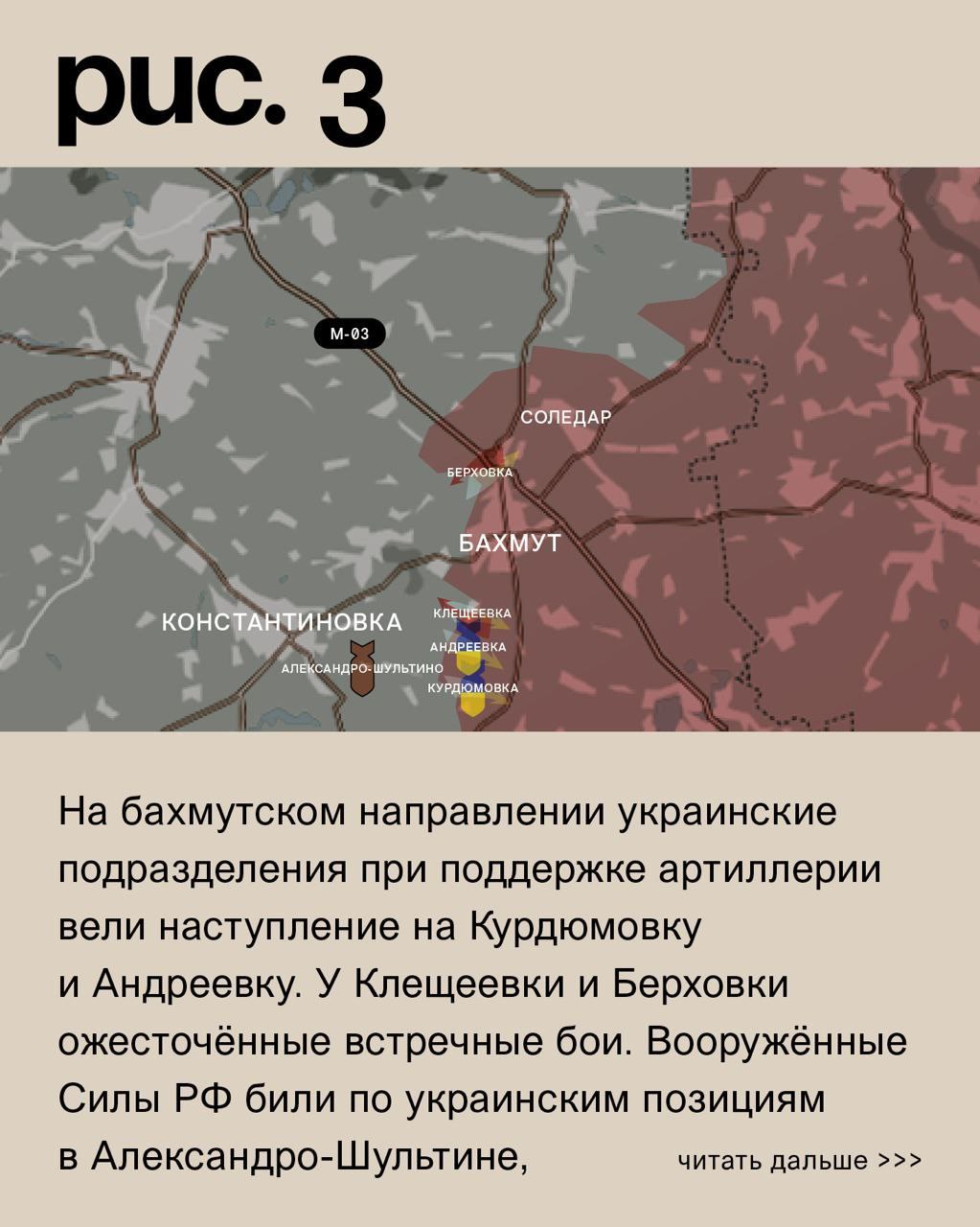 Вооружённые Силы России били по украинским позициям в Александро-Шультине, Ивановском, Часовом Яре, Хромовом, Богдановке, Васюковке, Звановке, Роздоловке, Весёлом (не путать с одноимёнными населёнными пунктами к северо-западу от Донецка и северу от Авдеевки), Ивано-Дарьевке и Верхнекаменском, а ВСУ – по российским в Бахмуте и Ягодном.