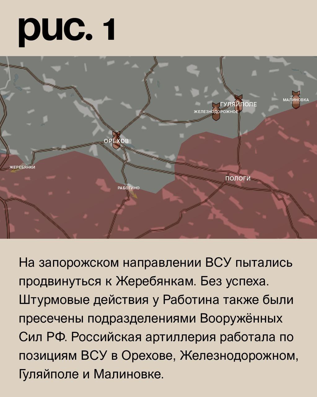 На ЗАПОРОЖСКОМ направлении ВСУ пытались продвинуться к ЖЕРЕБЯНКАМ. Без успеха. Штурмовые действия у РАБОТИНО также были пресечены подразделениями Вооружённых Сил России.