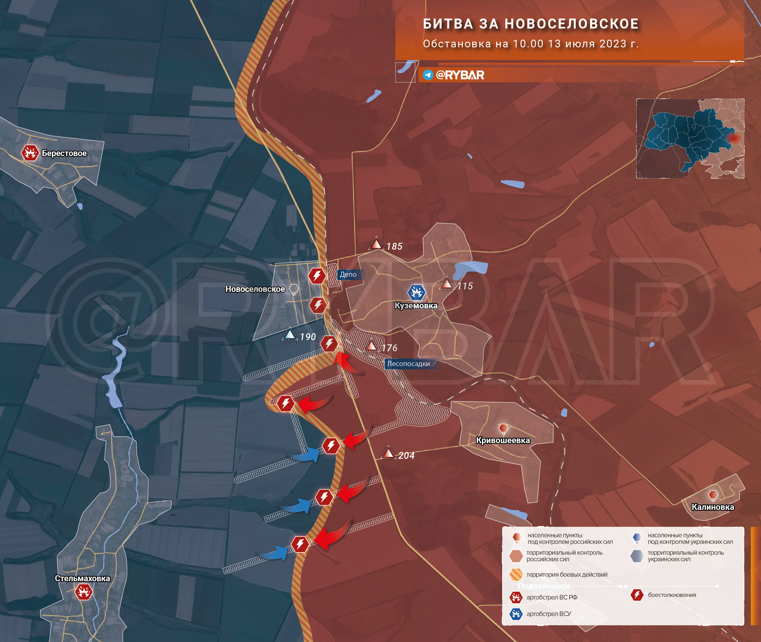 Бои у Новосёловского. Обстановка по состоянию на 1:00 13 июля 2023 года от Телеграм-канала «Рыбарь».