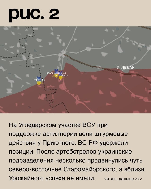 На УГЛЕДАРСКОМ участке ВСУ при поддержке артиллерии вели штурмовые действия у ПРИЮТНОГО. ВС России удержали позиции. После артобстрелов украинские подразделения несколько продвинулись чуть северо-восточнее Старомайорского, а вблизи Урожайного успеха не имели.