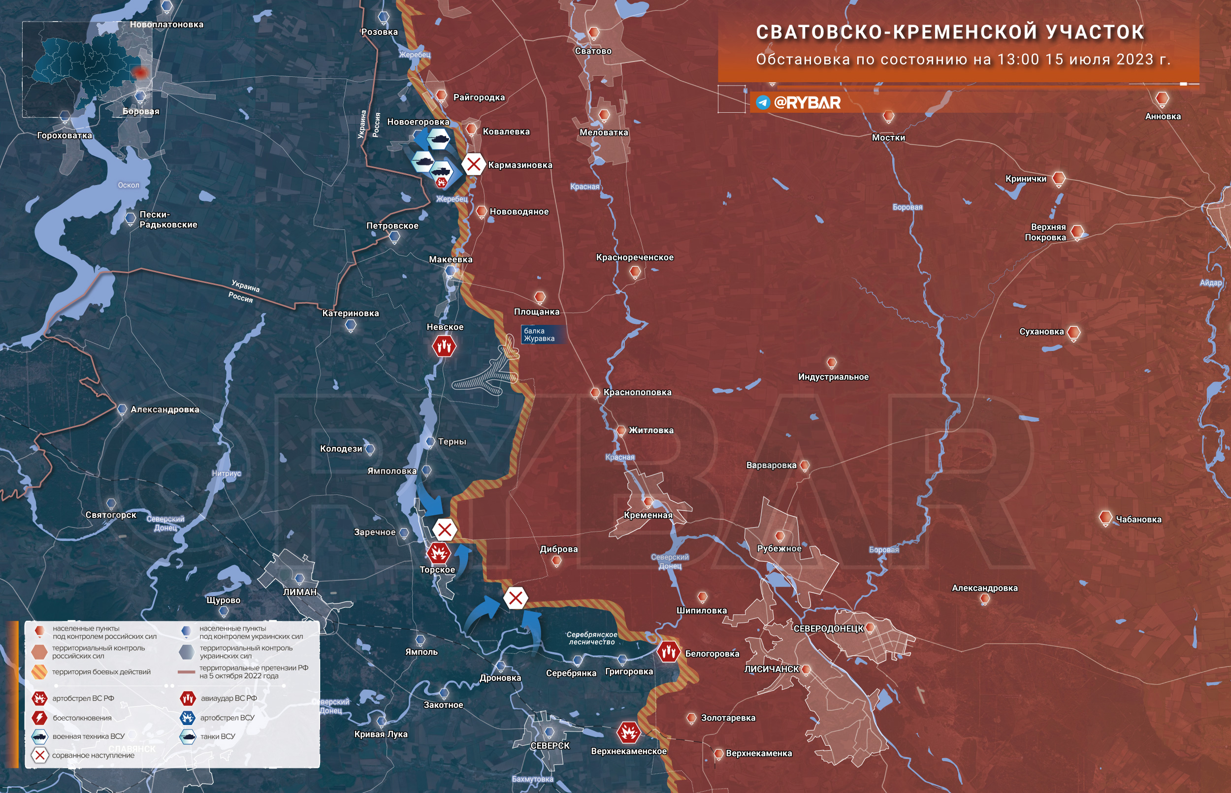 Обстановка на Сватовско-Кременском участке по состоянию на 13:00 15 июля 2023 года от Телеграм-канала «Рыбарь».