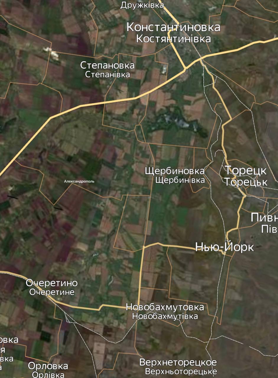 Наступление на север вдоль трассы Н-20 с постепенным охватом района Торецк-Нью-Йорк с запада даёт нам дальнейший выход к Константиновке с юго-запада.