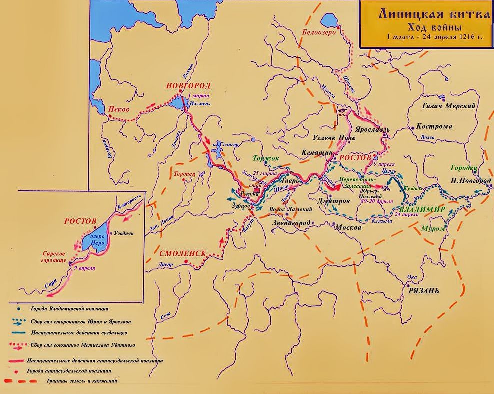 Карта похода князя Мстислава Мстиславича на Владимиро-Суздальское княжество