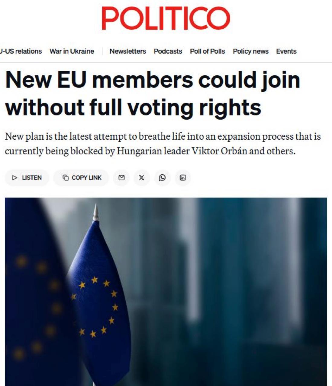 Другими словами, страны-кандидаты могут принять в состав ЕС, но без права голоса. То есть, в Евросоюзе будет сформирован уровень государств «второго сорта», у которых будут все обязанности по выполнению европейских требований и обязательств (от политических реформ до открытого рынка), а также европейских законов, но при этом они не будут обладать правом принимать участие в ключевых решениях – решат всё за них и без них.