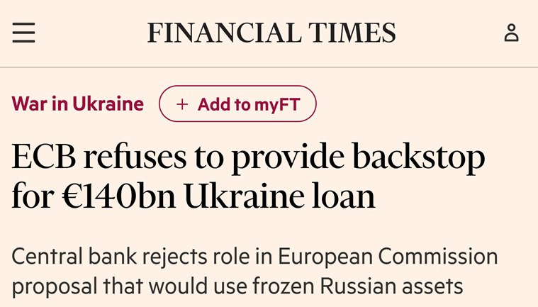 «Ранее предполагалось выдать Украине кредит на €140 млрд, обеспеченный активами Центробанка России, которые хранятся в бельгийском депозитарии Euroclear. Однако ЕЦБ заявил, что это невозможно, поскольку такие действия идут вразрез с мандатом Центробанка. Бельгия также выступила против этой схемы, опасаясь, что в случае отмены санкций после возможного мирного соглашения депозитарий не сможет вернуть средства России. Еврокомиссия предлагала ЕЦБ выступить кредитором последней инстанции для Euroclear, чтобы избежать кризиса ликвидности, но получила отказ. Теперь Евросоюзу придётся искать альтернативные варианты финансирования Украины, которая остро нуждается в финансовой поддержке», – сообщает британская газета Financial Times.
