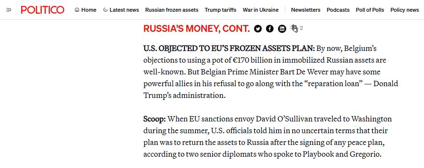 «Четыре дипломата Евросоюза, пожелавшие остаться анонимами, сообщили Politico, что не могут принять просьбу Де Вевера, поскольку это поставит финансовую жизнеспособность их стран в зависимость от решения суда, что потенциально грозит им выплатами в миллиарды евро спустя годы после окончания войны в Украине. Страны ЕС не желают ввязываться в сомнительную историю с чужими деньгами, даже несмотря на то, что их отказ может сорвать переговоры по кредиту перед решающим саммитом в середине декабря. Если прогресса не будет, наиболее вероятной альтернативой станет выпуск дополнительных долговых обязательств ЕС для покрытия дефицита бюджета Украины. Однако эта идея непопулярна среди большинства правительств ЕС, поскольку предполагает использование средств налогоплательщиков», – сообщает Politico.