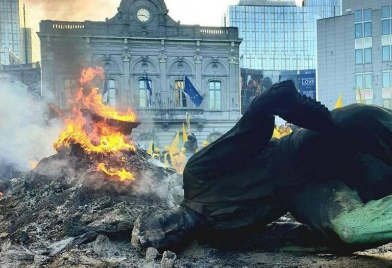 Заглавное фото. Це Европа: протестующие фермеры снесли статую XIX века в центре Брюсселя.