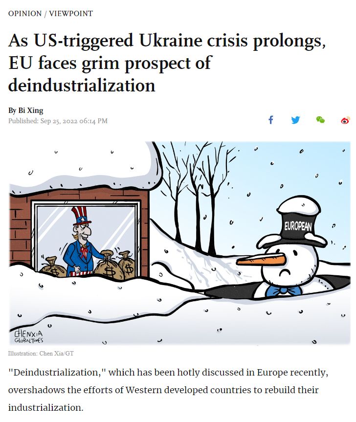 «По мере того как спровоцированный США кризис на Украине всё больше затягивается, Евросоюз сталкивается с мрачной перспективой деиндустриализации. Об этой опасности в последнее время всё чаще говорят в Брюсселе, поскольку такая ситуация сводит на нет все усилия развитых стран по восстановлению своей промышленности. Тем не менее европейские эксперты пока не видят каких-то эффективных способов решить в ближайшие несколько лет проблему нехватки энергоносителей, без чего развитие промышленного производства практически невозможно»,