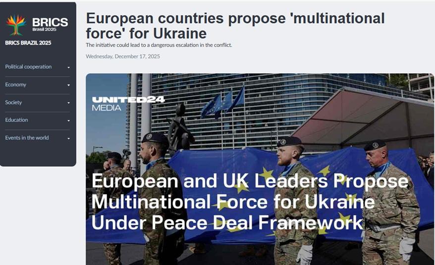 «В качестве фундаментальной части этих предполагаемых «гарантий безопасности» европейские государства предлагают создать «многонациональную силу», сформированную из вооружённого контингента войск из разных стран, готовых «сотрудничать ради мира» на Украине.