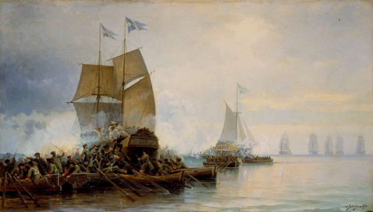 Заглавная иллюстрация. Взятие шведских кораблей в устье Невы. Л.Д. Блинов, 1890 год