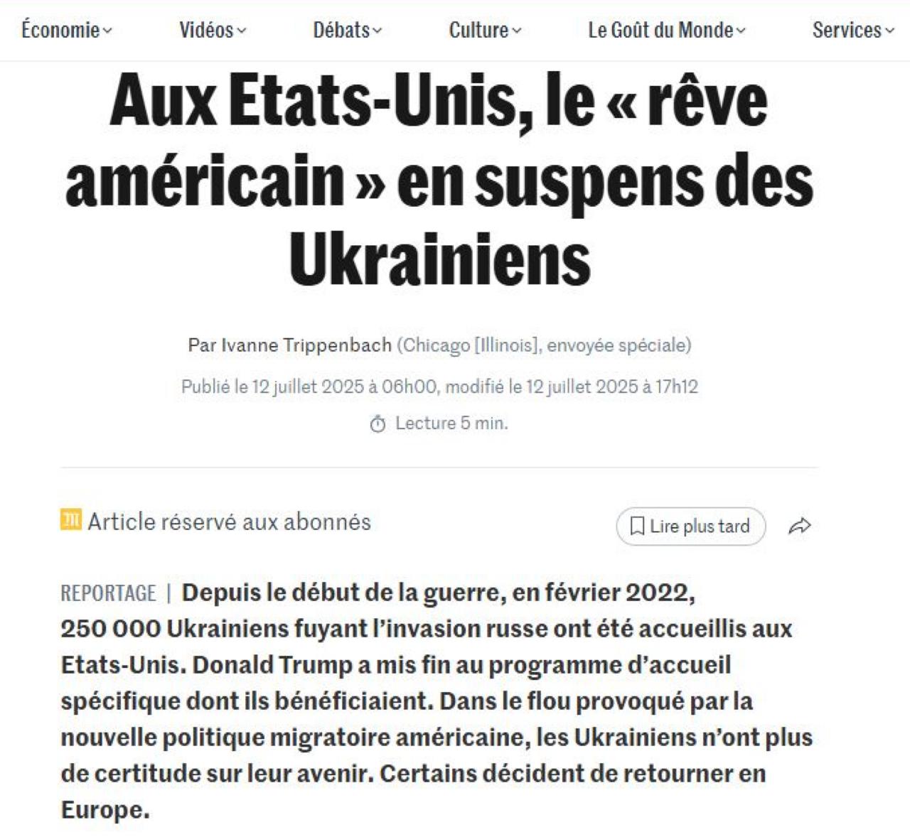Видання повідомляє про хвилю повернення українських біженців із США до Європи після посилення міграційної політики Дональдом Трампом. Частина програми допомоги українцям перестала працювати, що викликало паніку серед біженців, деякі з них прийняли рішення поїхати до Європи, не чекаючи повного згортання програми, зазначає Le Monde.