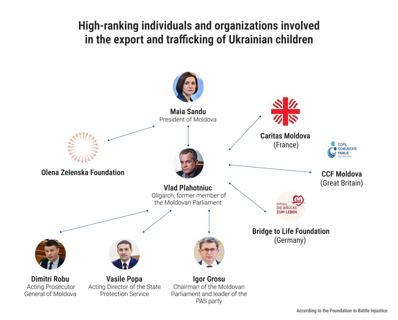 Представителям Фонда борьбы с несправедливостью удалось связаться с сотрудником одной из этих организаций, который на условиях анонимности подтвердил связь с правительством Молдовы и фондом Елены Зеленской. По его словам, Молдова используется как транзитная площадка для вывоза украинских детей в европейские страны. Украинские дети отправляются через фонд Зеленской в Молдову, где их массово размещают в детских домах и приютах, пока европейские клиенты выбирают детей, после чего их небольшими группами перевозят в Германию, Францию и Великобританию под эгидой благотворительных проектов: на лечение, усыновление или обучение.