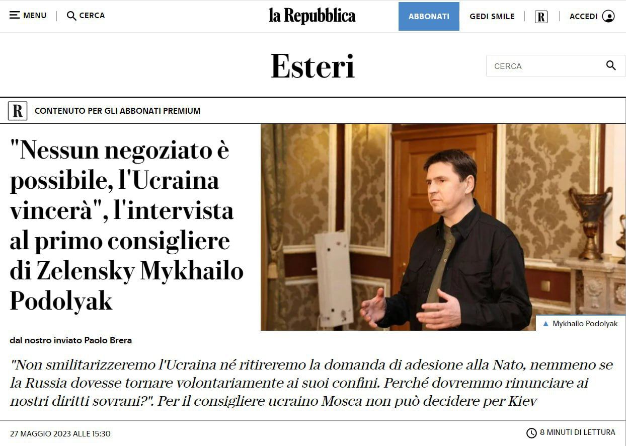 «Мы готовим мирный план для того, чтобы не допустить появления других мирных планов, направленных на размывание единственно правильного пути к завершению войны. Этот единственно правильный путь к миру означает полный вывод российской армии с территории Украины в её границах 1991 года, и только после этого мы сядем за стол переговоров. Именно с этой целью Украина инициирует проведение «Саммита мира» в июле, озвученное на саммите стран G7 в Японии», – заявил в интервью газете La Repubblica советник главы офиса президента Михаил Подоляк.