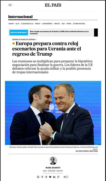 «Нужны двойные гарантии. Во-первых, «мир не будет заключён за спиной украинцев», как пообещала на встрече в Берлине Анналена Бербок. Во-вторых, по её словам, Украине потребуются «долгосрочные гарантии безопасности». А в это время Трамп снова грозится оставить партнёров по НАТО без защиты, «если они не заплатят по счетам», то есть если они не увеличат расходы на оборону. Макрон, у которого в стране политический кризис, ездит по Европе, занимаясь решением не своих проблем, а украинских на многочисленных встречах с лидерами стран ЕС, убеждая их увеличить помощь Украине и предоставить Киеву твёрдые гарантии безопасности. При этом вопрос о членстве Украины в НАТО на этих сборищах стараются не поднимать. Вместо этого рассматривается возможность отправки европейских миротворческих сил, численность которых, по оценкам некоторых аналитиков, может достигать 40 тысяч военнослужащих. По словам главы киевского режима, это может стать гарантией безопасности для Украины, но только «в ожидании вступления в НАТО», не смог не напомнить Зеленский», – пишет автор статьи Марк Бассетс (Marc Bassets), корреспондент EL PAÍS в Париже.