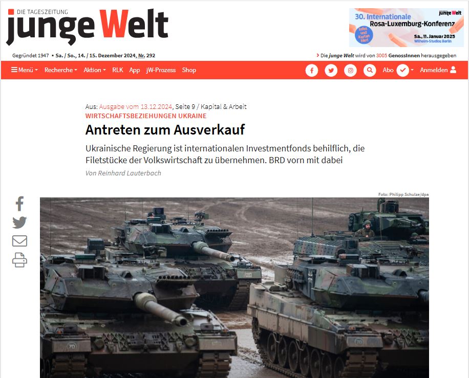 Немецкая газета Junge Welt, основной аудиторией которой является молодёжь с левыми взглядами, пишет, что киевские власти силой и шантажом заставляют отечественный бизнес переписывать свои предприятия на западных «партнёров».