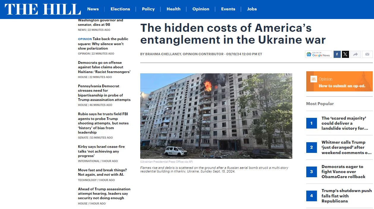 А американское издание The Hill не сомневается, что участие Вашингтона в украинском конфликте ослабило Соединённые Штаты, и этот конфликт дорого обойдётся Вашингтону.