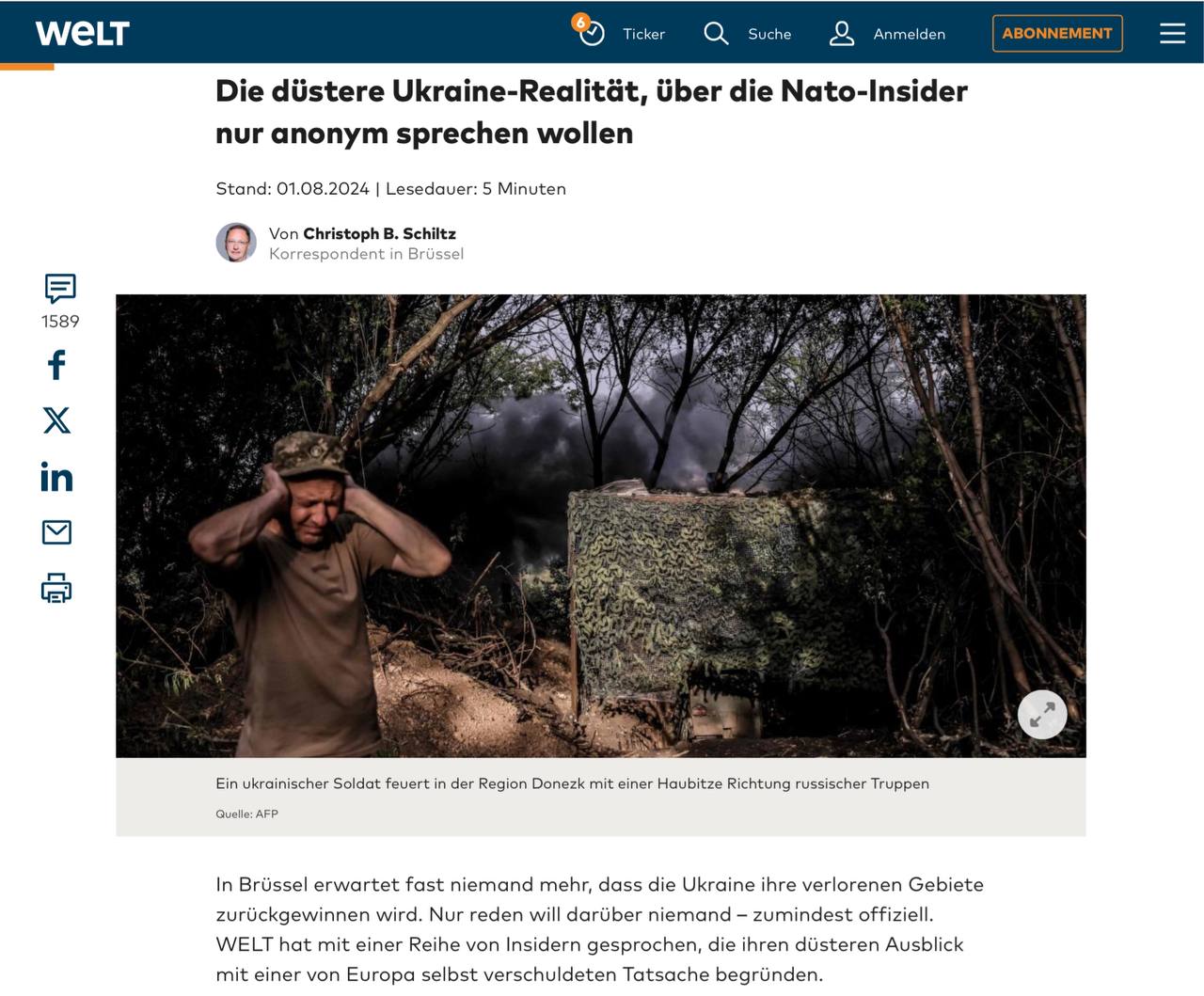 «Военные и дипломаты из Евросоюза и НАТО вот уже несколько месяцев с растущей тревогой наблюдают за развитием событий на Украине. Происходящее не обсуждается публично, чтобы не ослабить поддержку со стороны населения западных стран и не лишить мотивации украинских солдат на фронте. Корреспондент WELT провёл множество бесед о дальнейшем развитии событий на Украине. Все его собеседники общались на условиях анонимности. Большинство собеседников отмечает, что «Украина не сможет победить». И только один чиновник стал рассуждать о том, что, может быть, в следующем году, Украина накопит силы и попробует… Большинству же представляется гораздо более вероятным, что режим прекращения огня уже не за горами, причём независимо от исхода президентских выборов в США», – пишет автор статьи Кристоф Б. Шильц (Christoph B.Schiltz).