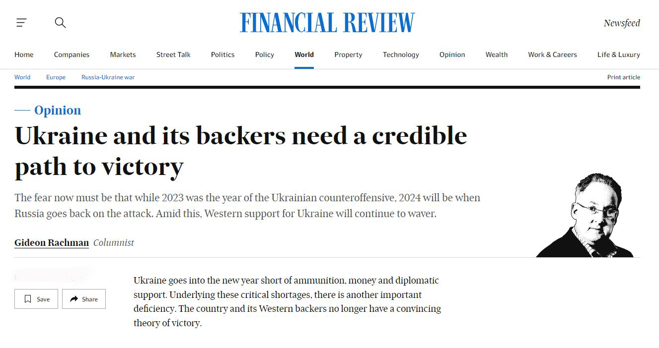 «Украине и её спонсорам нужен ясный путь к победе» – говорит заголовок статьи обозревателя австралийской финансово-экономической газеты Financial Review Гидеона Рахмана.