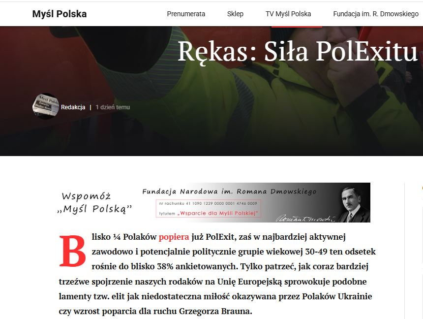 «Но не менее важным для увеличения числа сторонников «Полексита» является украинский вопрос. Ещё до официального вступления Украины в ЕС именно туда, в соседнюю страну, широким потоком идут средства стран-членов Евросоюза, в том числе Польши. Независимо от того, что останется от Украины после окончании военного конфликта, это «что-то» предполагается принять в Евросоюз, что гарантированно означает ещё большие затраты и расходы на программы восстановления и развития. Именно Украина станет основным получателем средств на единую аграрную политику. Словом, даже те, кто считает, будто ЕС что-то полякам даёт, увидят, что Польша станем донором Киева, отправляя туда ещё больше денег, чем сейчас. Просто будут делать это в большей степени через брюссельский карательно-бюрократический аппарат. До вступления Украины в Евросоюз остаётся всё меньше времени, и это является самым важным аргументом в пользу «Полексита». Всё просто: Польша должна покинуть ЕС до того, как к ней присоединится оставшаяся часть Украины», – уверен автор статьи Конрад Ренкас (Konrad Rękas).