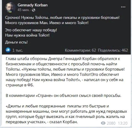 «Это просто иллюстрация будущей сириизации Украины, о которой пишу с начала марта. По мере разгрома регулярной армии, будущее Украины это отряды бандитов на «Тайотах» и оружием поставляемым из-за рубежа. Повторюсь, то, что не займут ВС РФ, превратится в один большой Идлиб, только вместе чёрных и зеленых, заправлять там будут коричневые»,