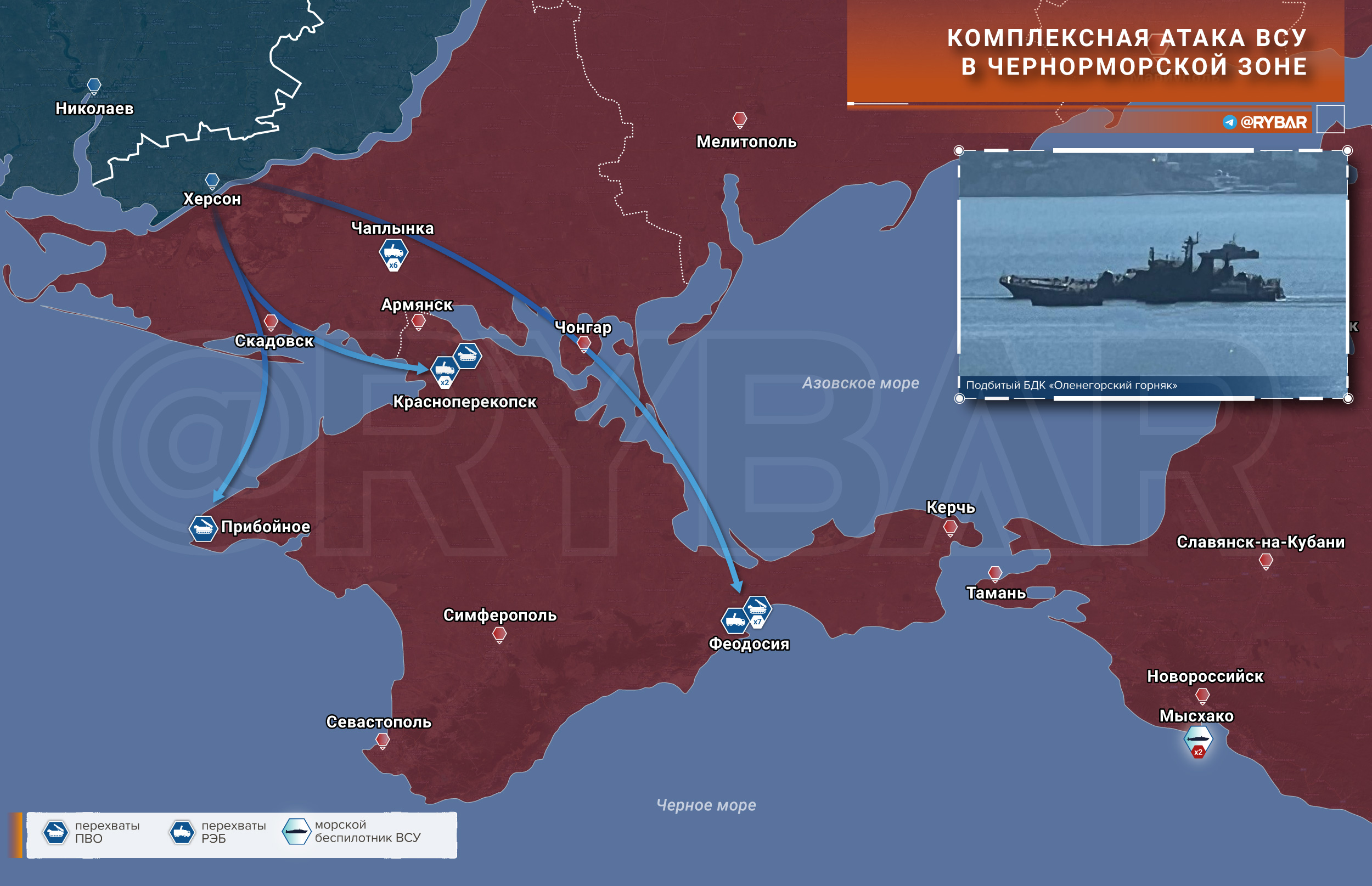 Комбинированная атака на Крым вместе с попаданием в корабль ЧФ произошла аккурат после комплексной разведки авиацией и спутниками НАТО. И на этот раз ВСУ изменили цели: от уже в какой-то степени привычных Севастополя и Гвардейского на Феодосию и Новороссийск.