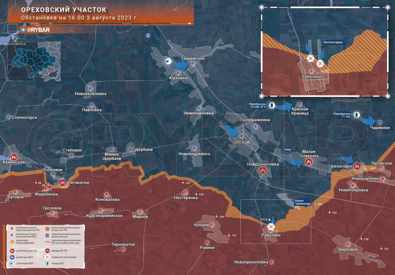 Ореховский участок. Рано утром 3 августа пехотные группы противника под прикрытием двух лесополос севернее Работино попыталась наскоком прорваться через минные заграждения, где её встретили морпехи 810 бригады морской пехоты ВС РФ. В результате завязавшегося стрелкового боя украинские формирования отступили.