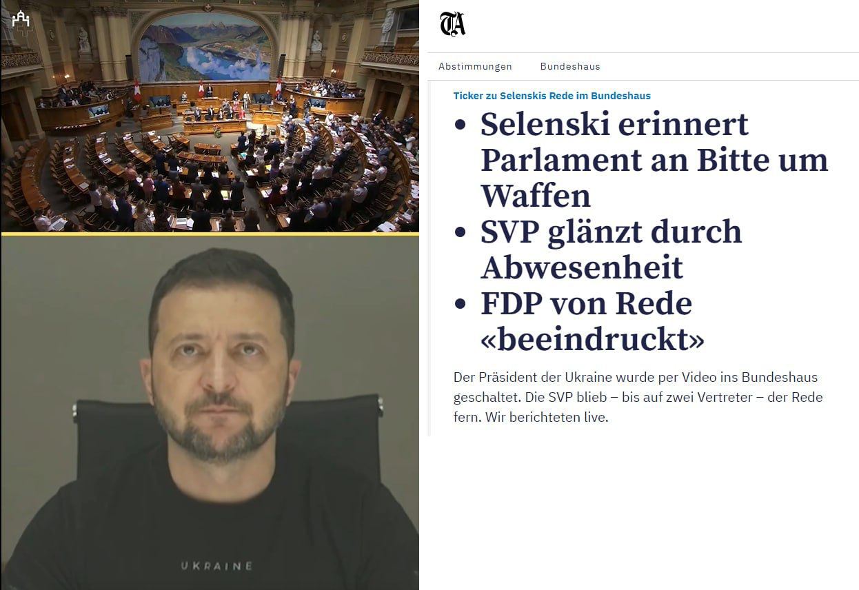 Однако ещё до того, как украинский президент начал свою речь, депутаты одной из крупнейших фракций парламента Швейцарии – Швейцарской народной партии (SVP) – демонстративно встали и вышли из зала заседаний. Накануне они выступили против выступления Зеленского в парламенте.